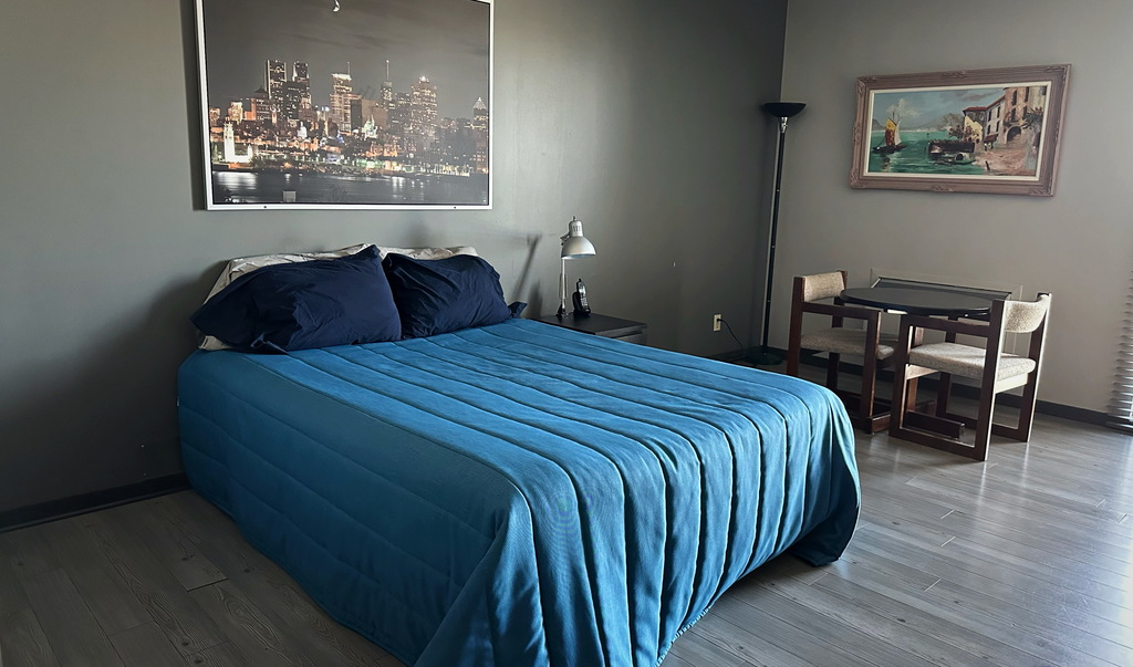 Chambre avec un lit parfaite pour un ou deux invités. Spacieuse et équipée d'un petit réfrigérateur, d'un micro-onde, d'une table avec deux chaises, d'une télévision et d'un sèche-cheveux.
